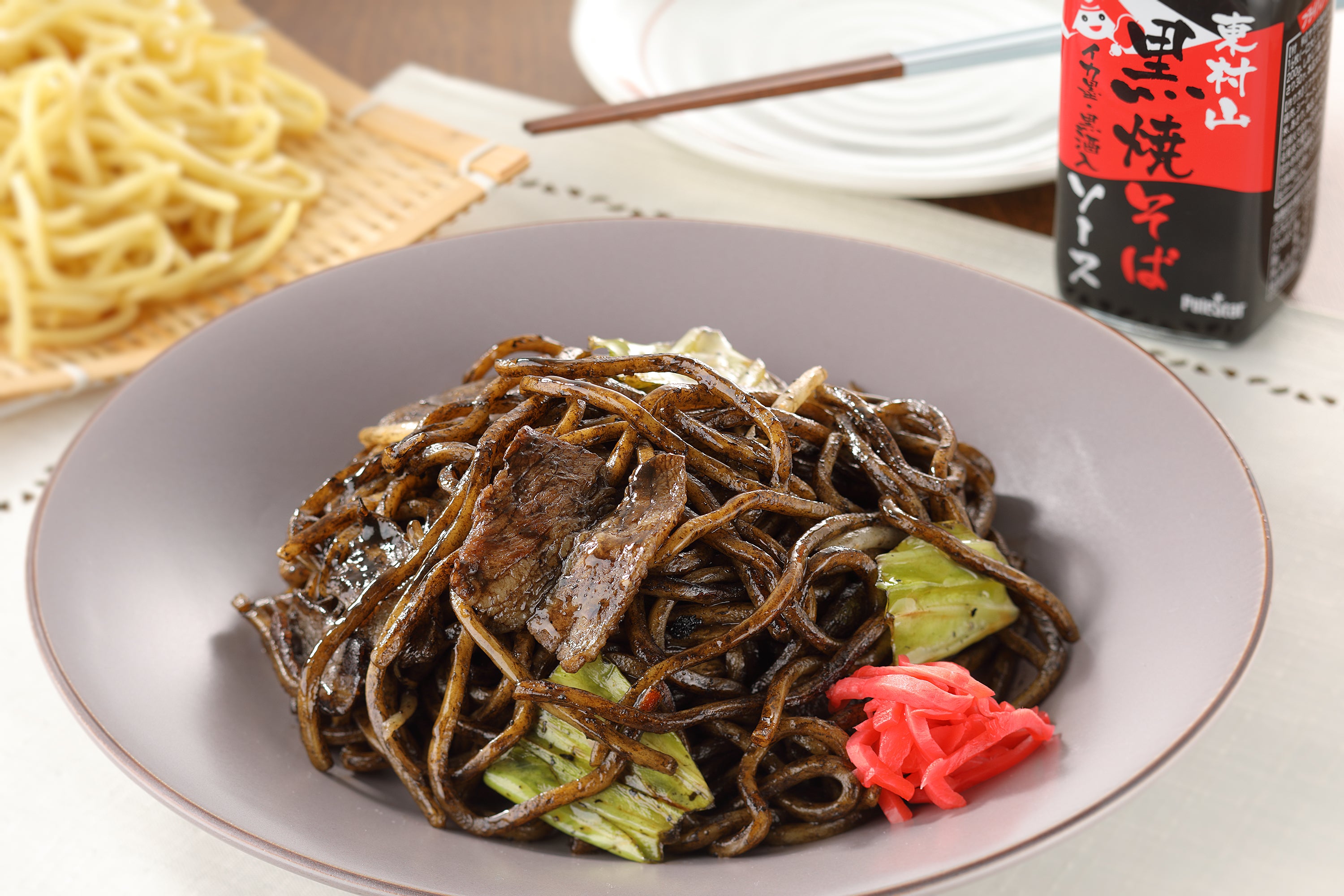 ・独自のウスターソースにうま味成分のアミノ酸をたっぷりと含んだイカ墨、食材本来のうま味を引き出す鹿児島の黒酒を使用。「東村山黒焼そば」の奥深い香りにつながっています。