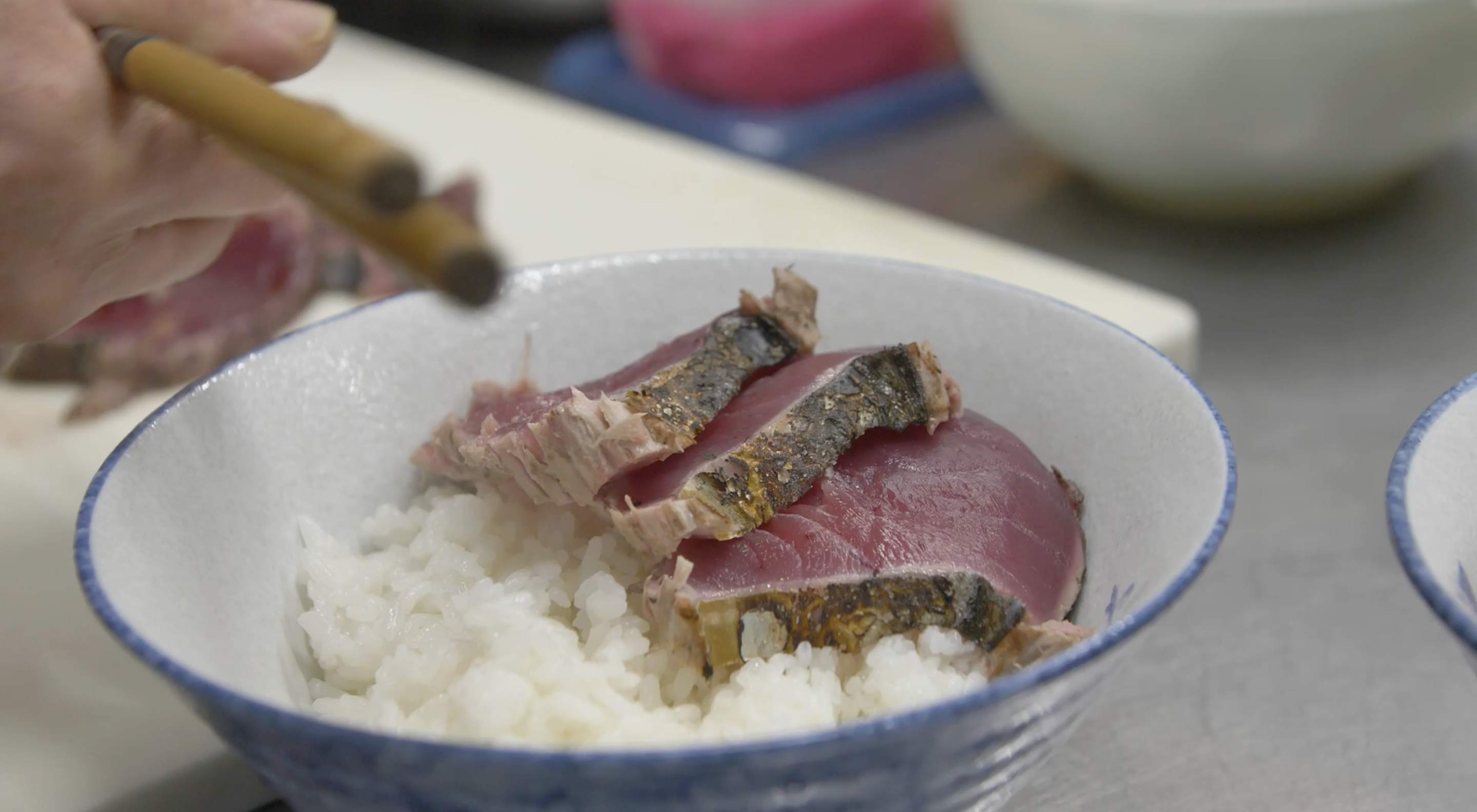藁でかつおの表面を焼くことで香りを付けて、うま味を閉じ込めています。醤油やお酢を少し入れたオリジナルタレで食べます。かつおの消費量日本一の高知県で古くから愛されている食べ方です。