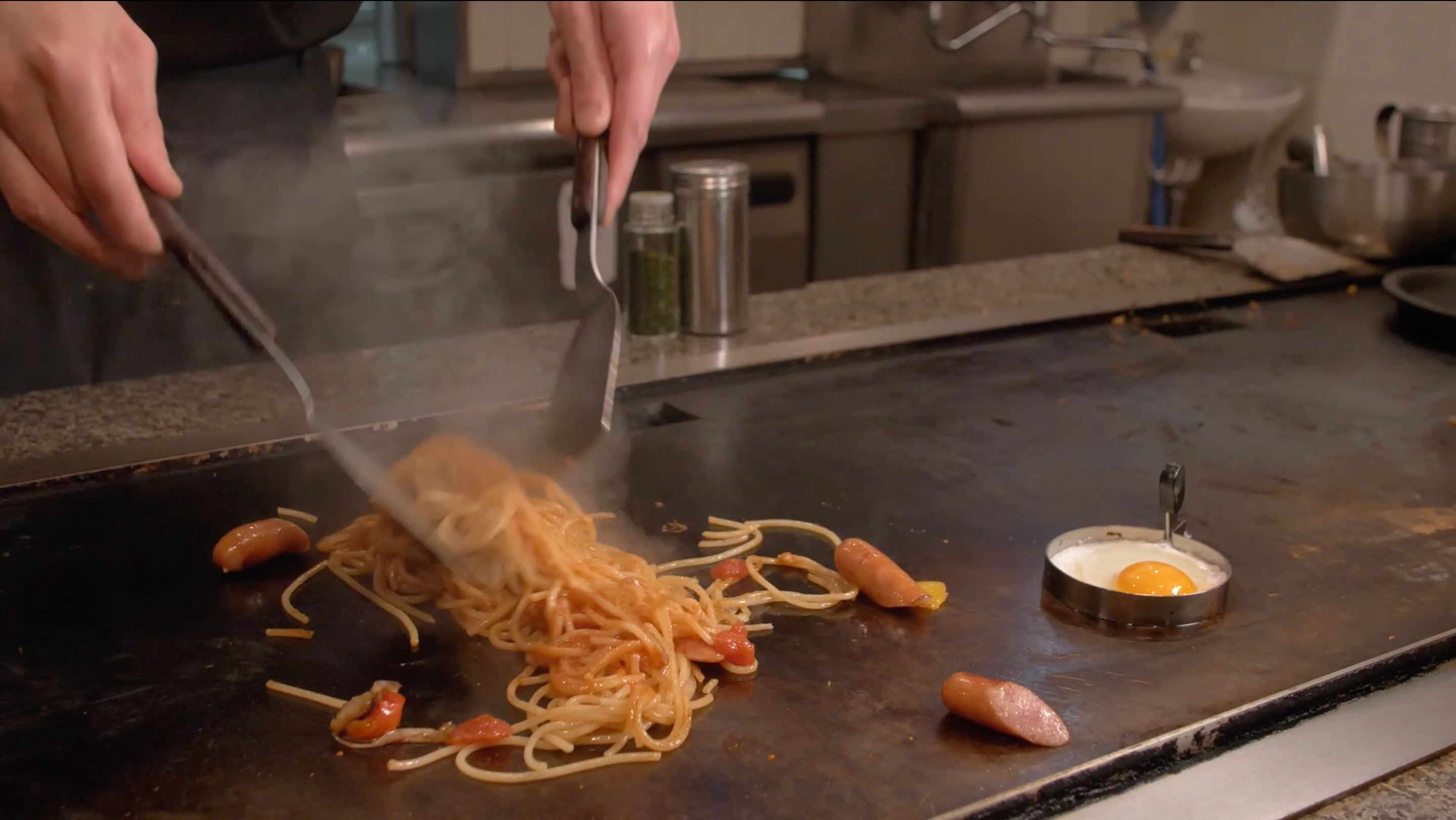 ・鉄板でアルデンテに仕上げたスパゲッティ。