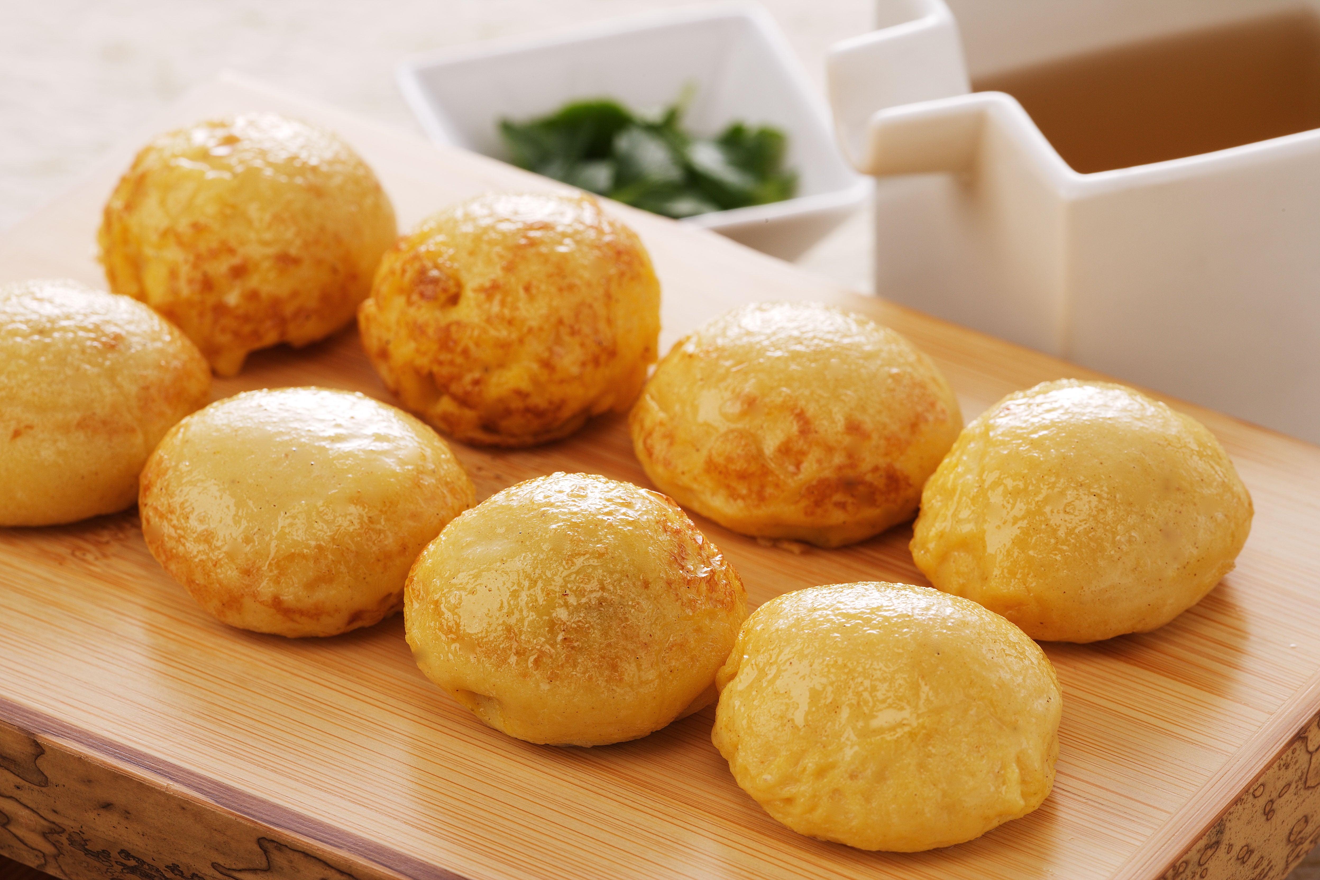 ・小麦粉に加え、浮き粉(小麦粉のでんぷんを精製したもの)を使用。たこ焼とは異なる、ふわとろ、プルンといった食感が楽しめます。
